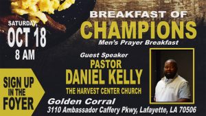 Calling ALL Men!The Men of Faith will gather at the Golden Corral in Lafayette this Saturday at 8AM. Pastor Daniel Kelly from The Harvest Center Church will be the guest speaker. Come and enjoy fellowship, a full breakfast, and an encouraging word to empower you to be the champion God intended you to be. Please see Pastor David Sampy for cost and detail. Invite the men in your life and make plans to attend.